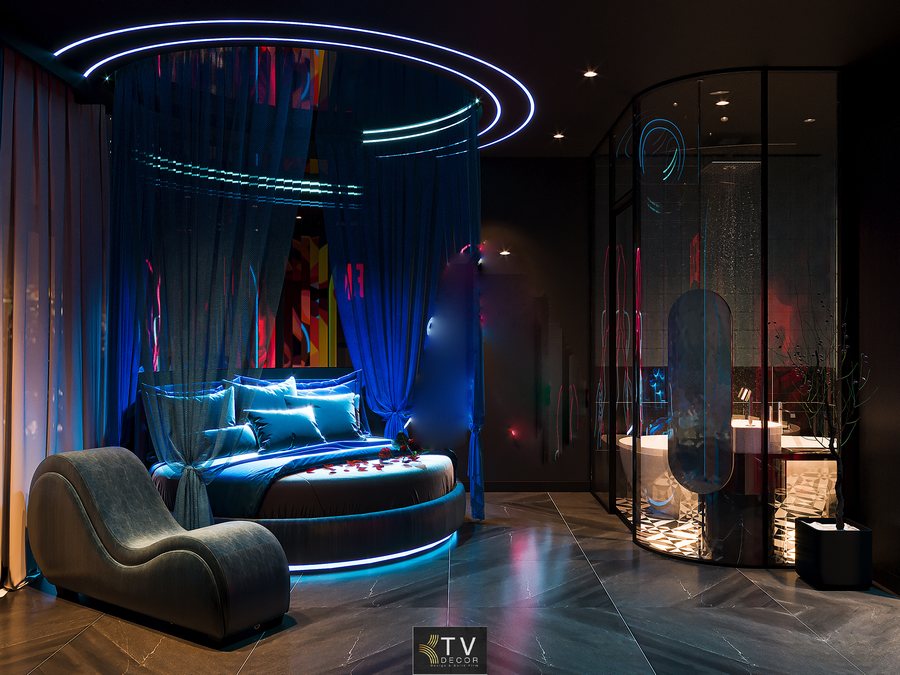 Phòng khách sạn này là minh chứng cho xu hướng thiết kế nghỉ dưỡng kết hợp giải trí cao cấp, nơi ánh sáng, chất liệu và màu sắc được phối hợp hài hòa để tạo nên trải nghiệm độc đáo cho du khách.