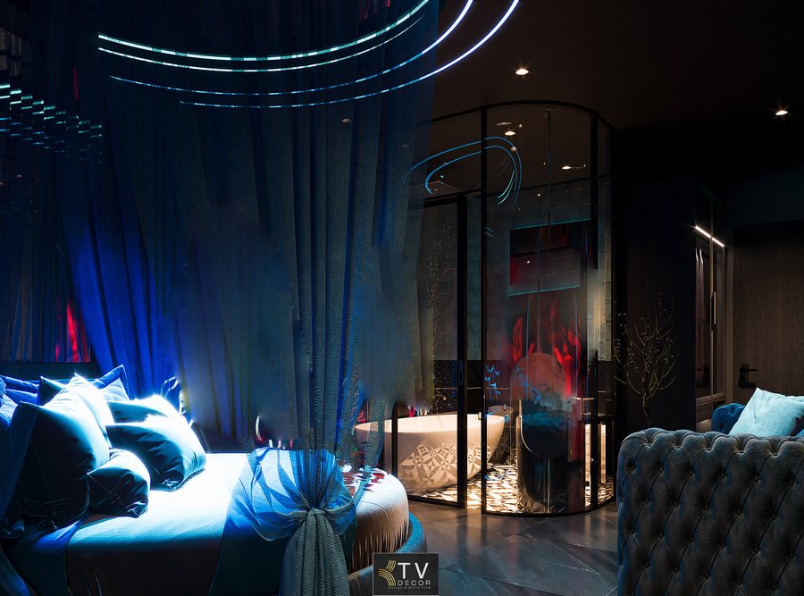 Tông màu chủ đạo xanh lam – đen tạo chiều sâu thị giác, kết hợp cùng hệ thống đèn LED viền trần và giường giúp căn phòng trở nên cuốn hút, thời thượng.