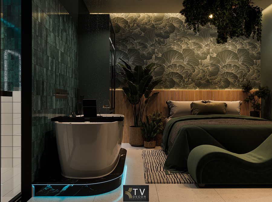 Bồn tắm được bố trí ngay trong khu vực nghỉ ngơi, kết hợp đèn hắt LED và nền đá đen ánh lam, tạo hiệu ứng ánh sáng sang trọng.