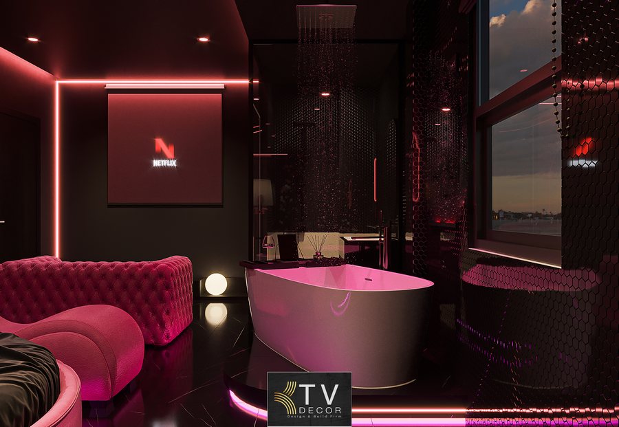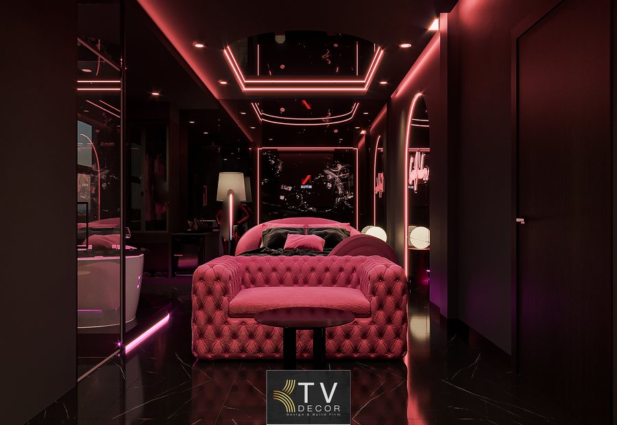 Thiết kế phòng khách sạn hiện đại với ánh sáng neon hồng ấn tượng do KTV GROUP thực hiện