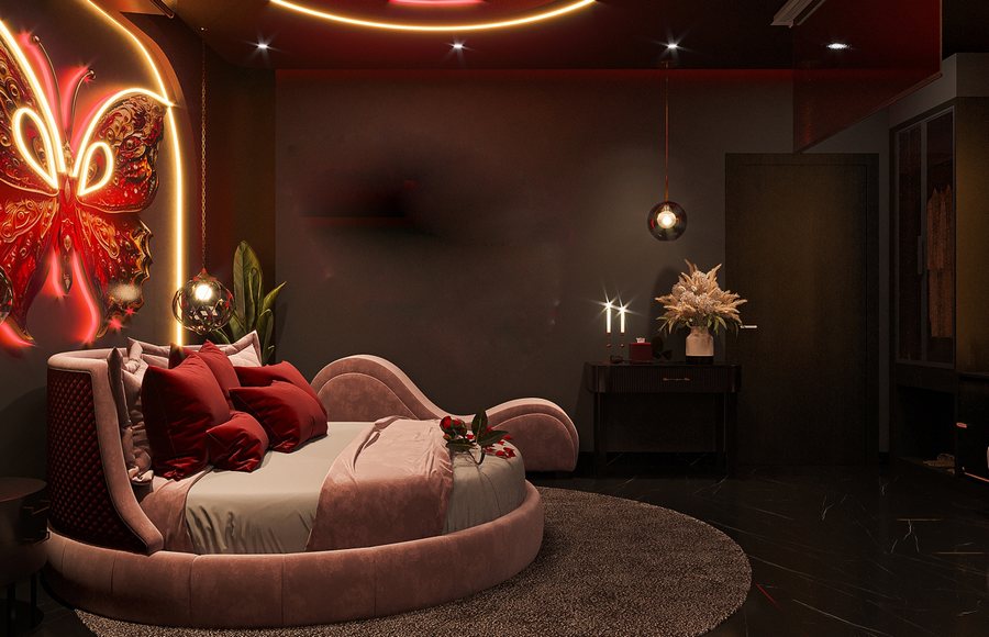 Không gian được thiết kế theo concept “Seductive Light”, trong đó mỗi chi tiết ánh sáng đều được tính toán tỉ mỉ nhằm tôn lên sắc thái lãng mạn và gợi cảm của căn phòng.