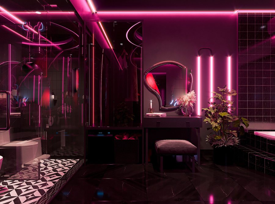 Phong cách chủ đạo: Hiện đại, ánh sáng LED nghệ thuật, tinh tế. Tông màu: Đỏ đô – đen – ánh tím lạnh.