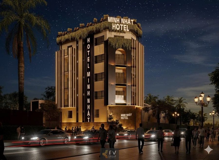 KTV GROUP mang đến thiết kế mặt tiền khách sạn Minh Nhật theo phong cách Hiện đại (Modern), tạo ấn tượng mạnh mẽ ngay từ cái nhìn đầu tiên. Dự án sở hữu quy mô 6 tầng với diện tích xây dựng khoảng 400m², nổi bật bởi hệ thống đèn LED viền tòa nhà, ánh sáng vàng ấm hòa quyện cùng sắc trời đêm tạo hiệu ứng thị giác sang trọng và thu hút.