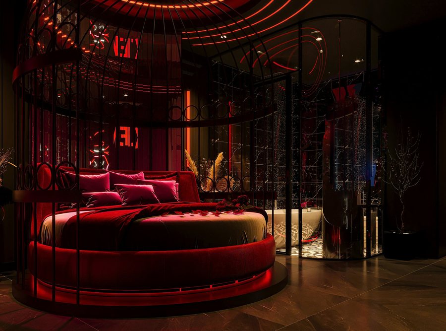 Phòng khách sạn được thiết kế với giường tròn bao khung sắt nghệ thuật độc đáo, tạo điểm nhấn khác biệt giữa không gian. Sự kết hợp giữa tông màu đỏ – đen và ánh sáng LED hắt trần giúp căn phòng vừa mang vẻ hiện đại, vừa gợi cảm giác ấm áp và sang trọng.