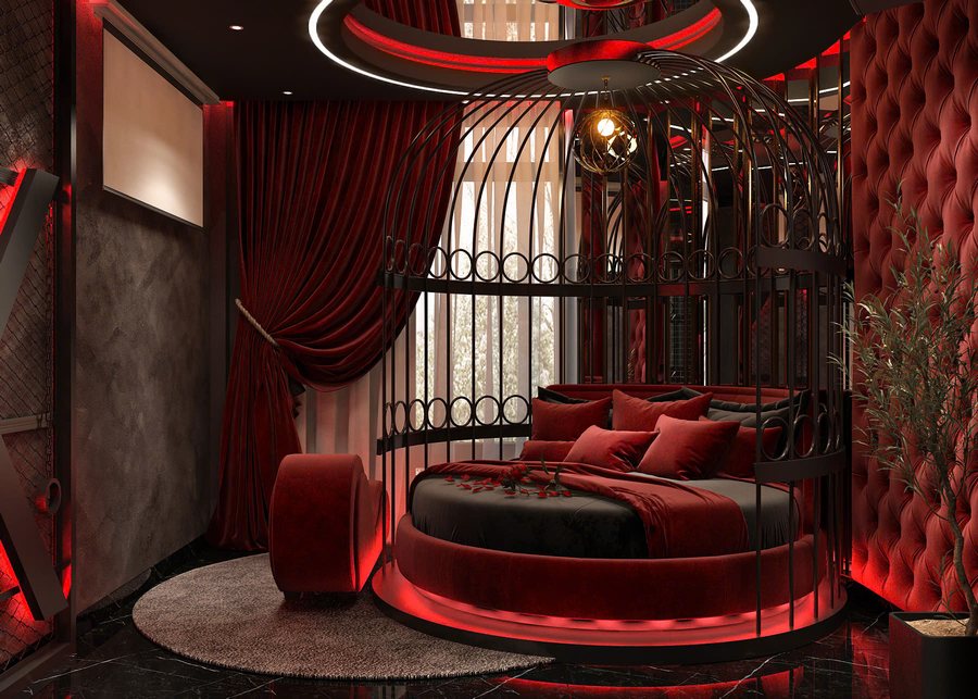 Thiết kế nội thất phòng khách sạn cao cấp giường tròn khung sắt, ánh sáng LED đỏ đen hiện đại
