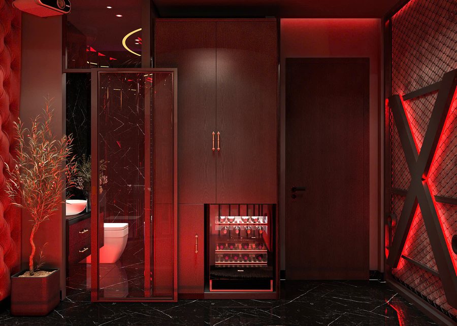 Tường bọc da nhung đỏ nổi khối, kết hợp hệ đèn chiếu sáng ẩn.