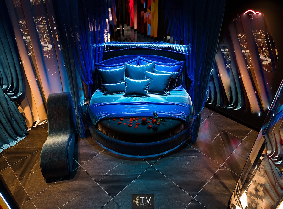 Không gian phòng khách sạn lãng mạn với giường tròn, ánh sáng xanh huyền ảo và nội thất cao cấp – Dự án thiết kế bởi KTV Group