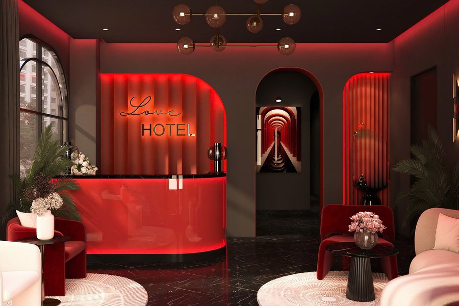 Thiết kế quầy lễ tân khách sạn chủ đề tình yêu theo phong cách Hiện Đại Tối Giản, phối sắc đỏ ánh kim nổi bật và ánh sáng ấm tinh tế tạo không gian đón khách sang trọng.