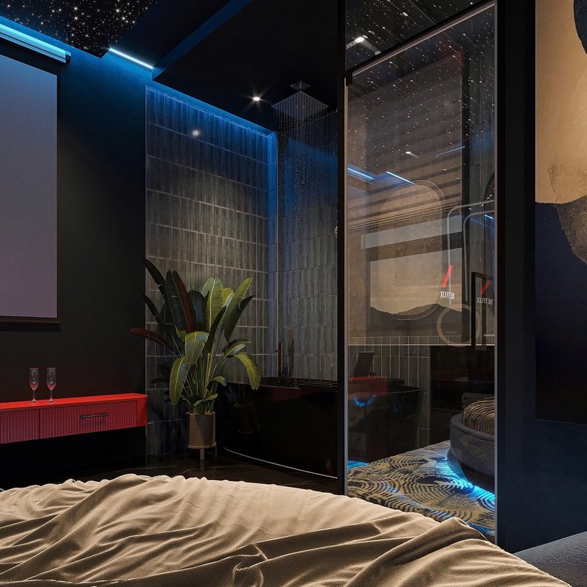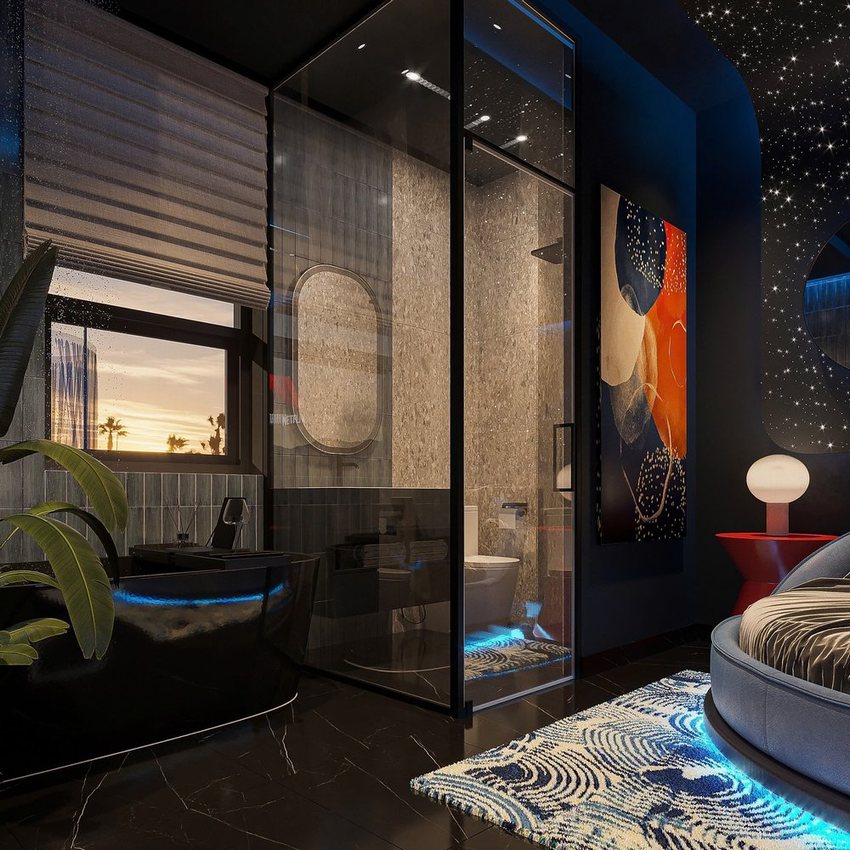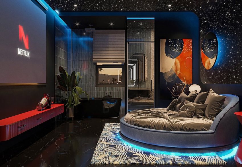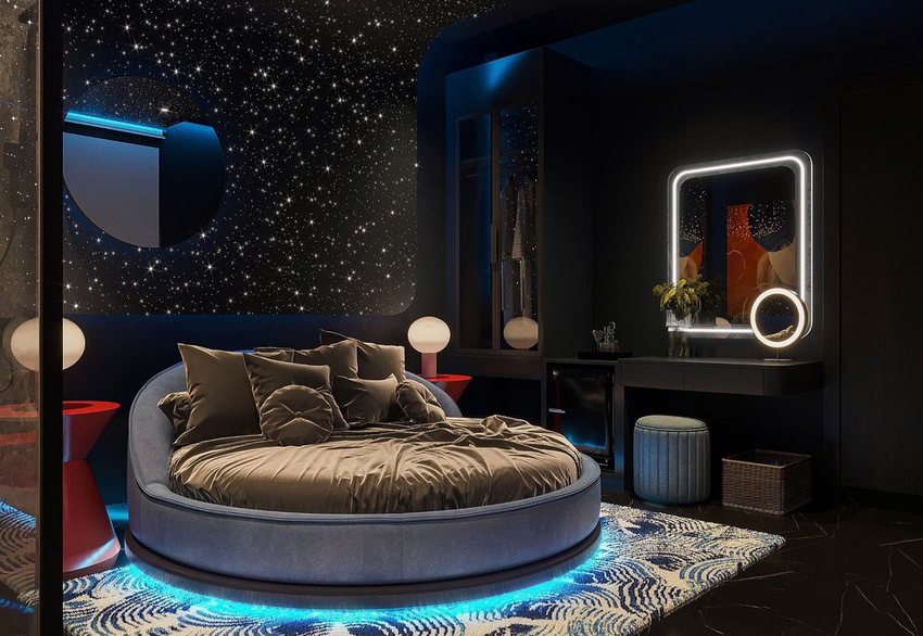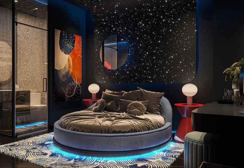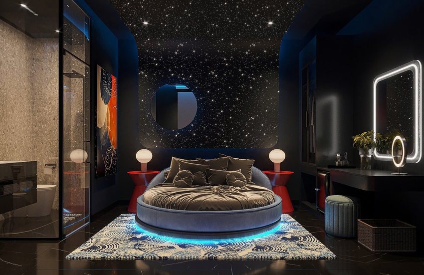 Thiết kế thi công khách sạn tình yêu phong cách vũ trụ độc lạ – Giường tròn, trần sao và bồn tắm thư giãn đầy ấn tượng (Lượt xem : 134 )